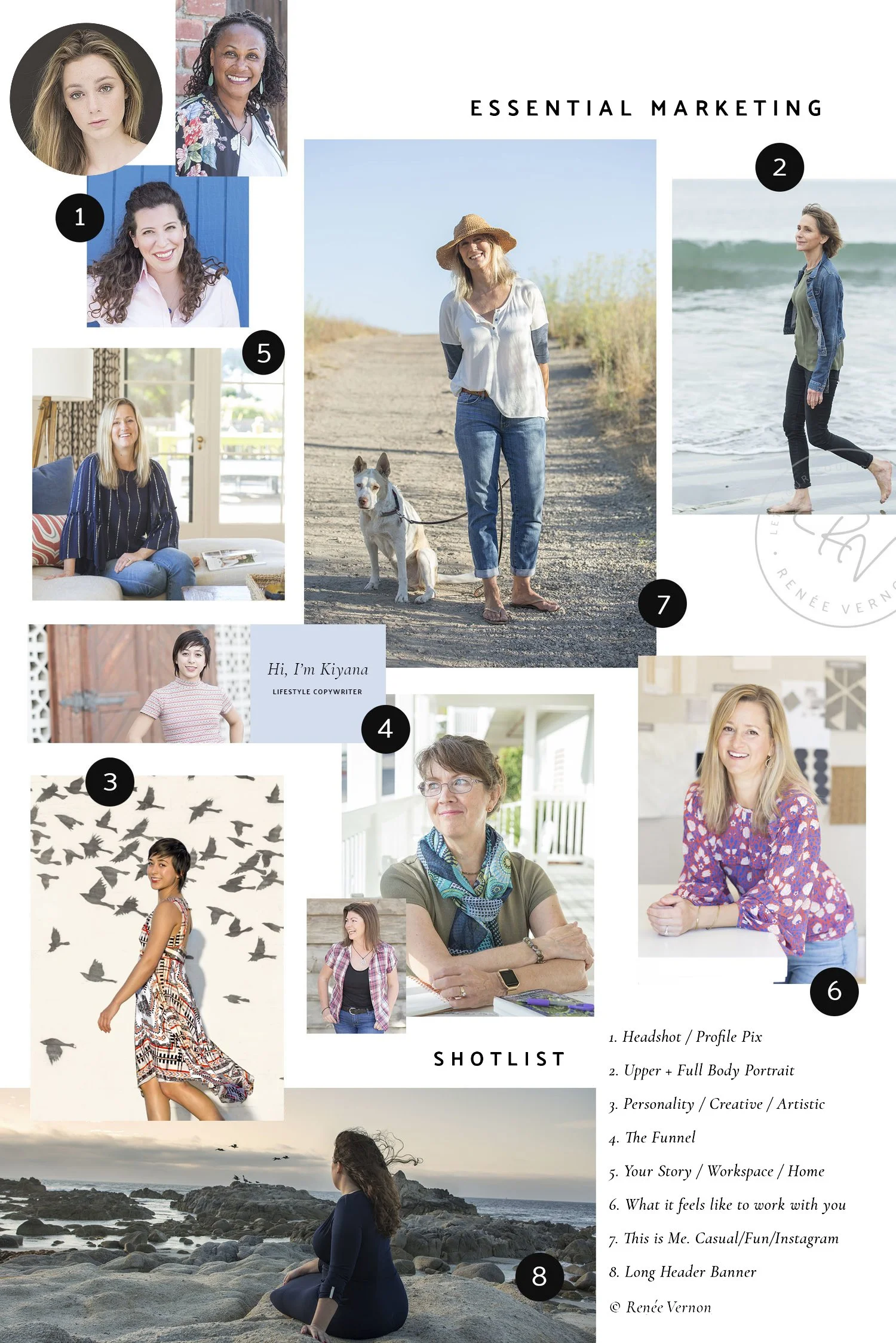 I did extensive research and worked with some top designers. I discovered there is a secret world out there involving image placement, typography, funnel shots, and yes, even your fabulous headshot or profile pic will have a different vibe depending on myriad factors. Below is an example moodboard of a variety of “Essential Marketing Shotlist” type photos we may take, but tailored to your particular brand marketing and/or social media needs...